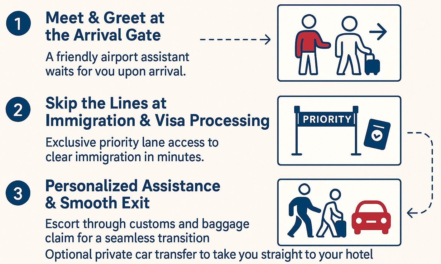 Airport procedures can be confusing for new visitors. Our team member will meet you inside the terminal with a welcome board and guide you through every step: from visa stamping to priority immigration lines, baggage claim, and exit.